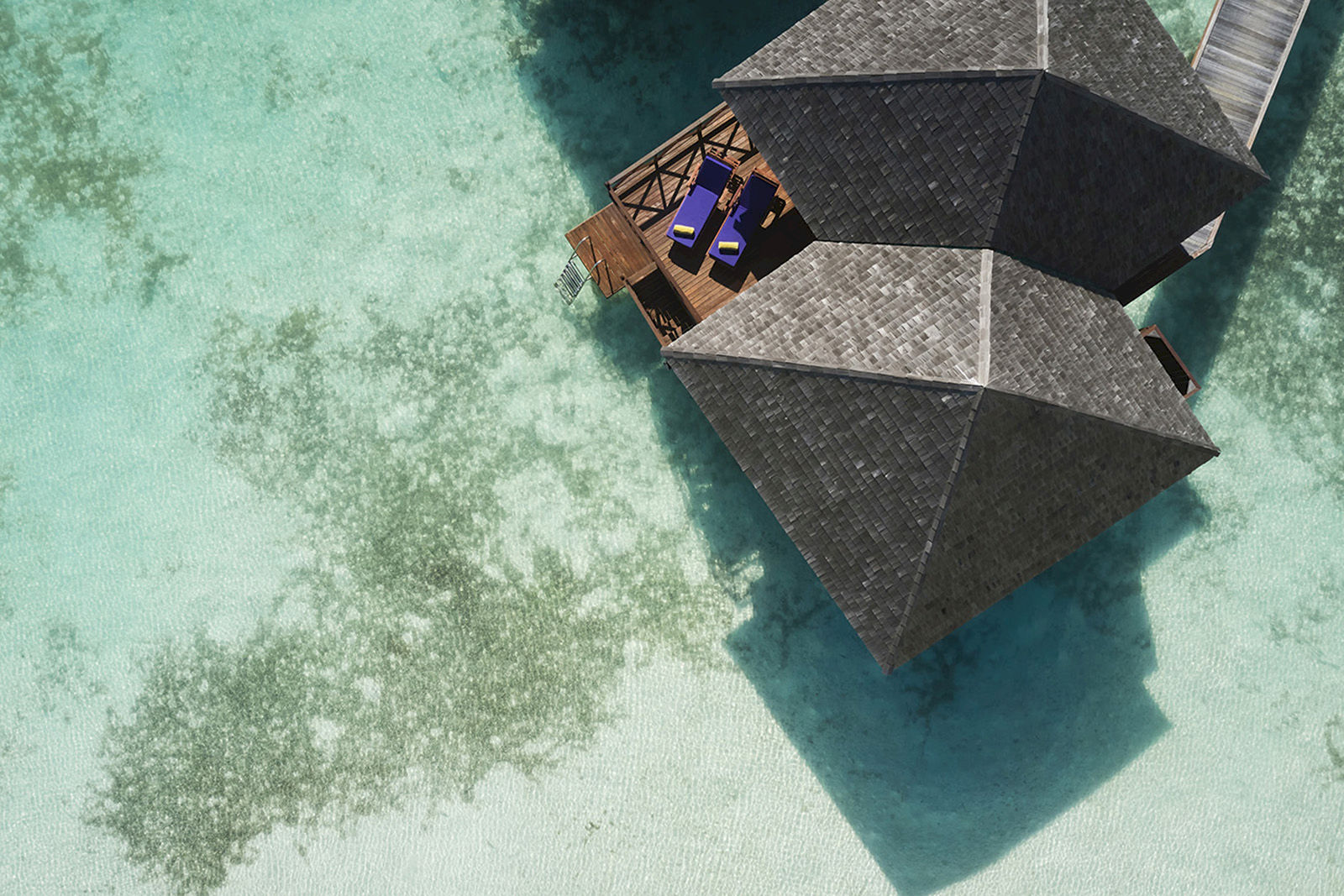 Perched above the lagoon, this villa blends traditional charm with Maldivian simplicity. A shingled roof and dark wood interiors create a warm retreat, while the wooden sundeck invites sunbathing and sweeping views across the Olhuveli islands. Designed as the perfect overwater hideaway for two, it offers a serene escape where the lagoon is always just a step away.