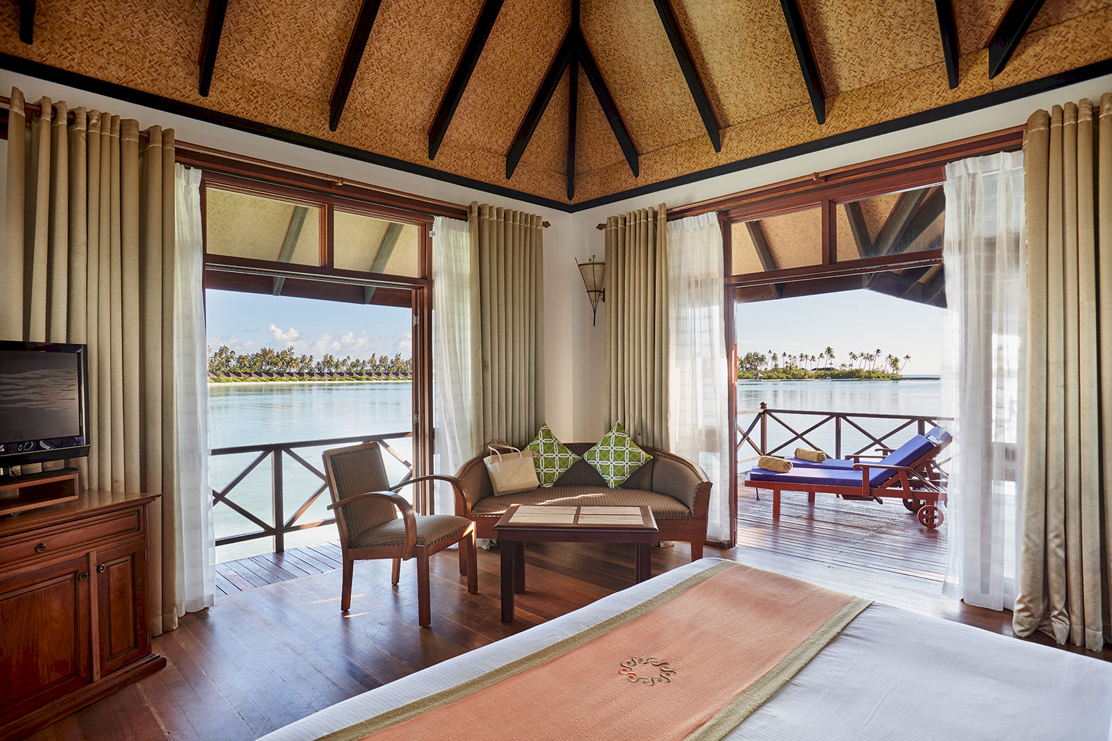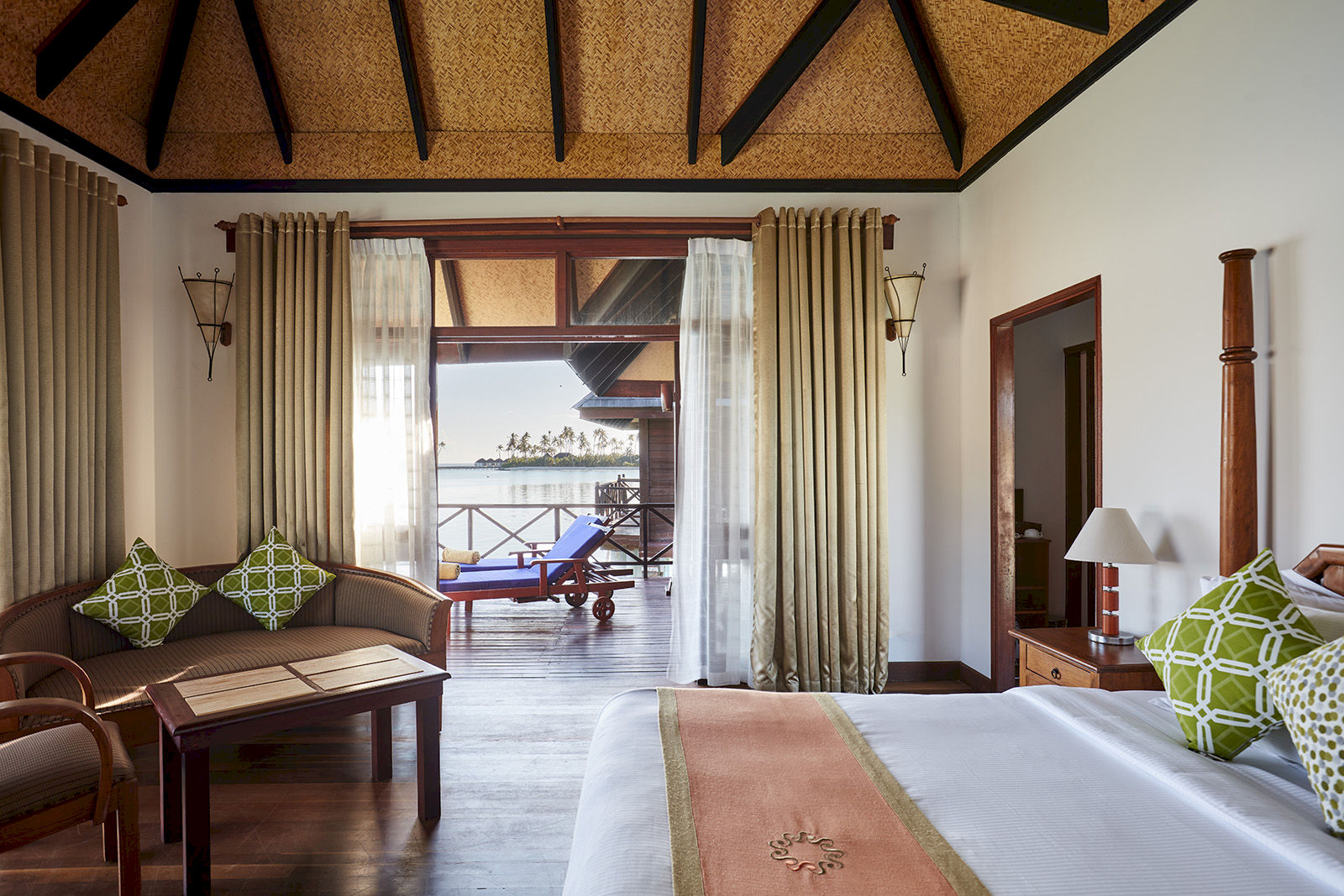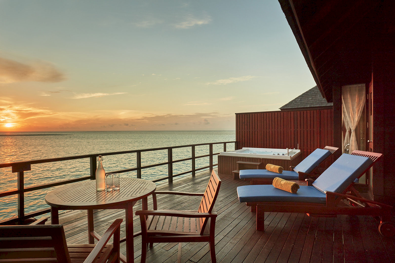 Spacious and stylish, the Deluxe Water Villa offers an elevated take on classic Maldivian living. A master bedroom with a cozy living corner frames sweeping ocean views, while the bathroom features a freestanding tub overlooking the lagoon. Outside, a private sundeck with direct stairway access to the water lets you slip straight into the Indian Ocean, making this villa a serene haven for couples or small families.