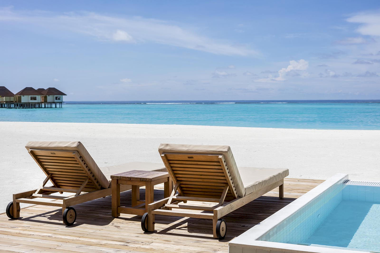 Spanning 101 sqm, this contemporary suite offers sleek beachside living with space to spare. A separate living room opens onto a verandah facing the sea, while the tropical white-washed bathroom brings the outdoors in. The private beachfront pool is the highlight, framed by daybeds perfect for lounging between dips. Designed for families or friends, it combines generous space with effortless Maldivian style just steps from the lagoon.