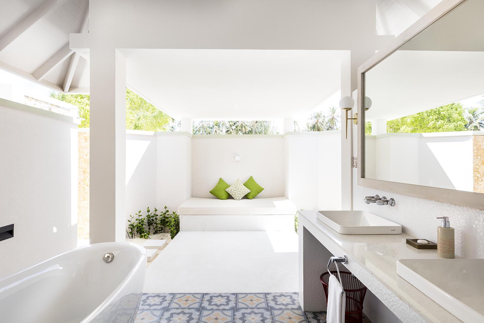 The quintessential Maldivian escape, the Grand Beach Villa opens directly onto soft sands and lagoon views. A king-size bed faces the sea, while the semi-open bathroom features both indoor and tropical outdoor showers. Step onto your private terrace with loungers that flow seamlessly onto the beach, creating the perfect setting for sun-soaked days and tranquil nights. Spacious and inviting, it’s a true beachfront haven for couples or families.
