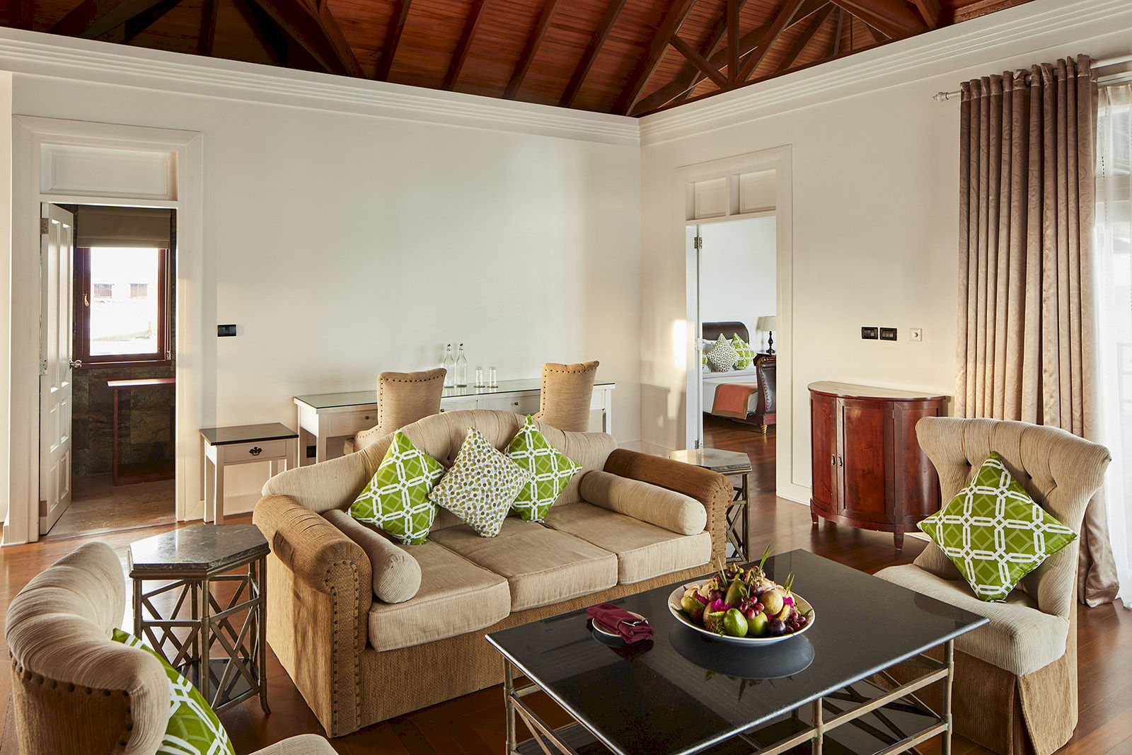 Calm and contemporary, the Beach Pavilion blends taupe, black, and grey tones with striking photography for a serene ambience. Cleverly designed with a terrace or balcony, daybed, and couch, it feels spacious yet cozy. Interconnecting options with Twin or King-size rooms make it perfect for couples or families. Just steps from the beach, it also offers direct access to the Maldives’ longest 210-metre swimming pool, complete with a sunken bar for ultimate relaxation.