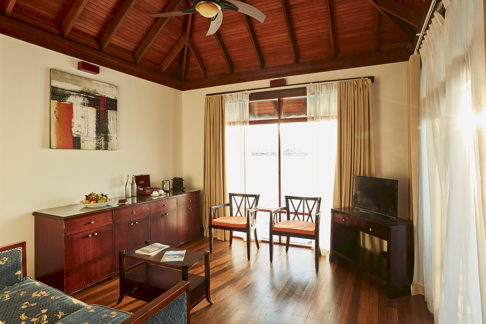 Set on the main island’s beach with a terrace extending over the lagoon, Lagoon Bar is the perfect spot for cocktails and evening entertainment. Enjoy a wide selection of drinks while watching lively Maldivian performances and soaking in the stunning lagoon views. It is an ideal place to relax, unwind, and enjoy vibrant tropical evenings in a chic overwater setting.