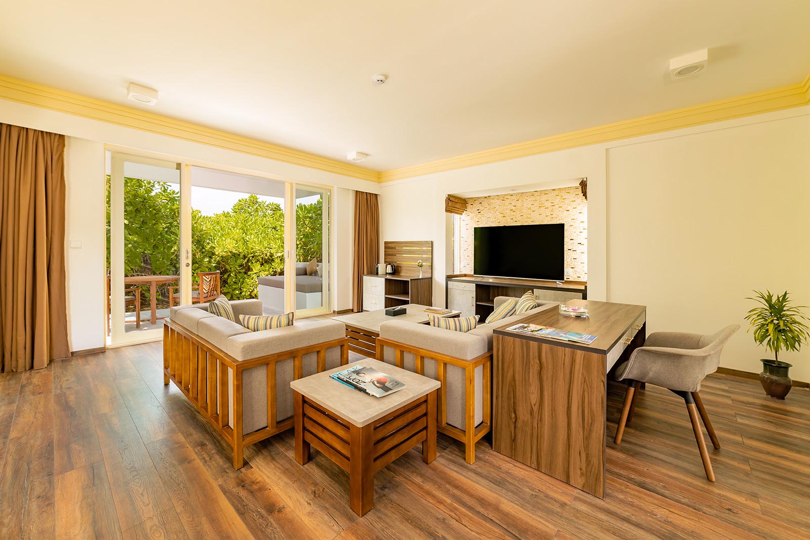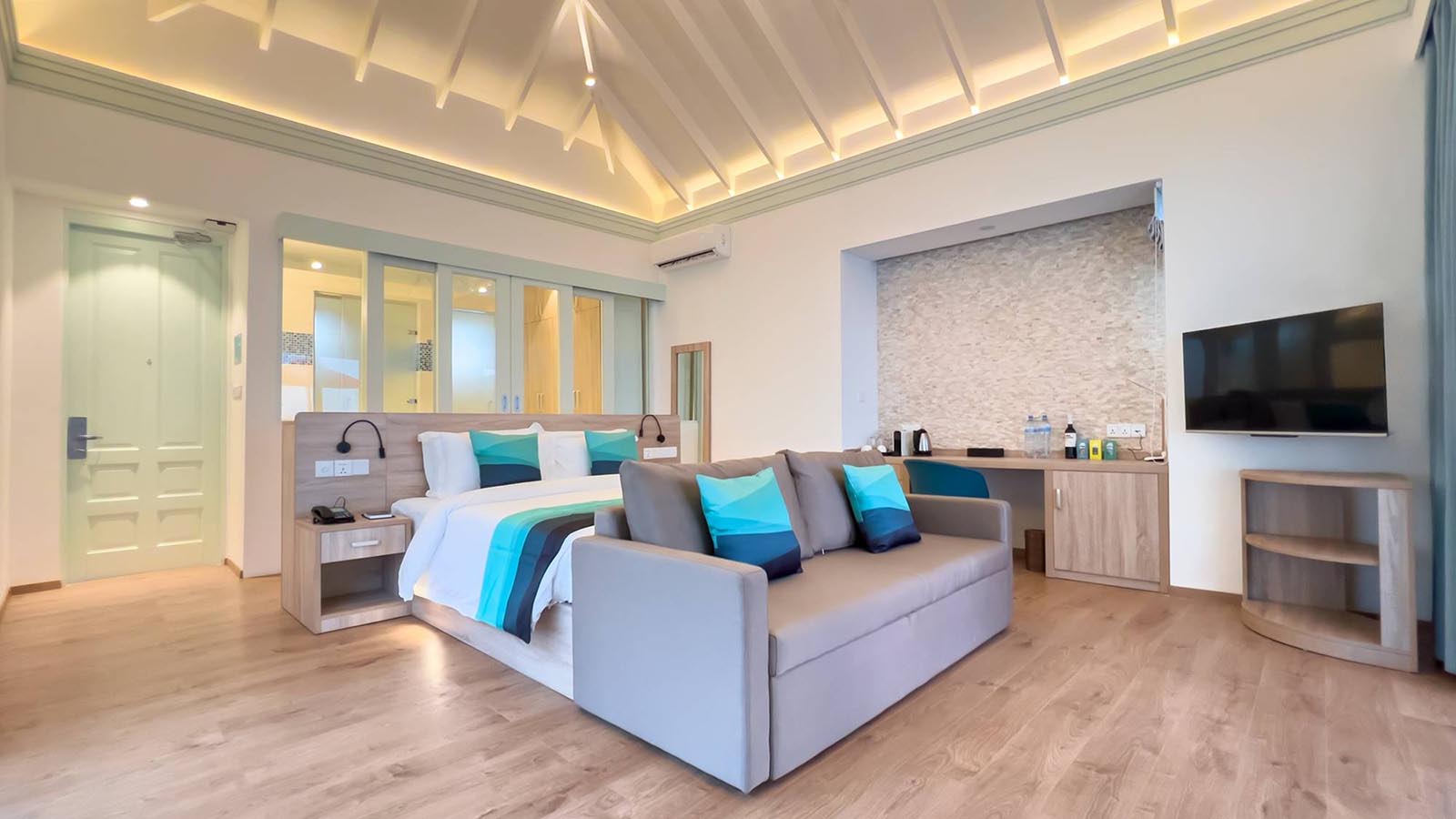 This 102 sqm beachfront suite combines style, space, and relaxation. Enjoy a private pool, separate lounge, and expansive terrace with direct lagoon access. Inside, a super king-size bed, sofa bed, bathtub, and indoor and outdoor showers provide comfort for up to three adults or a family of five. Mini bar and Wi-Fi complete this elegant tropical retreat.