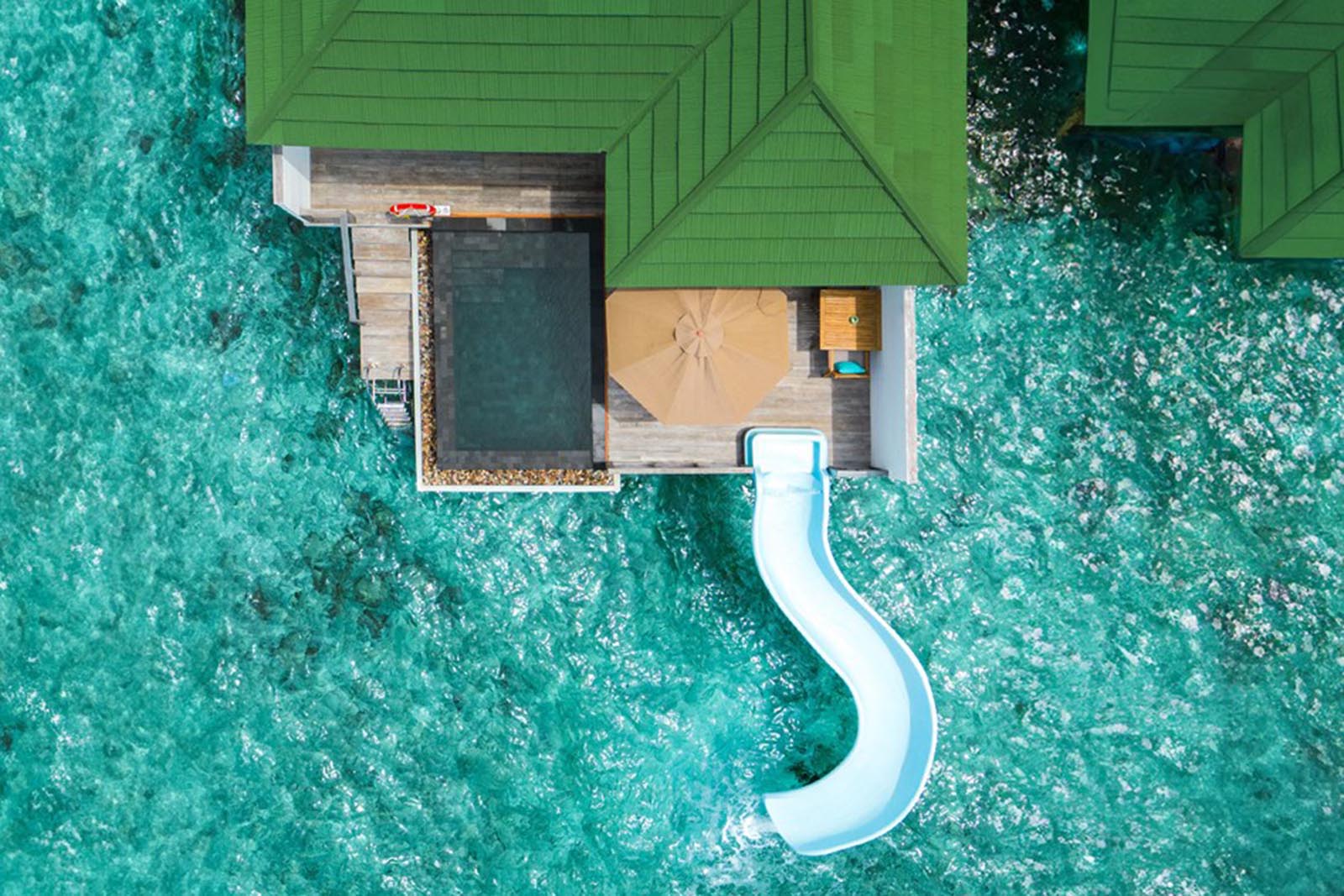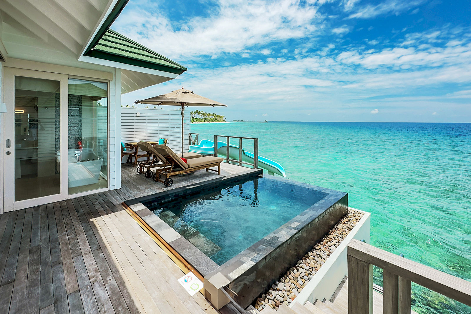 This 81 sqm overwater villa blends fun and relaxation with a private pool and a thrilling slide into the lagoon. Lounge on your sun deck, refresh in the indoor shower, enjoy a mini bar and Wi-Fi, and take in panoramic ocean views. Perfect for couples or small groups seeking a playful and unforgettable escape.