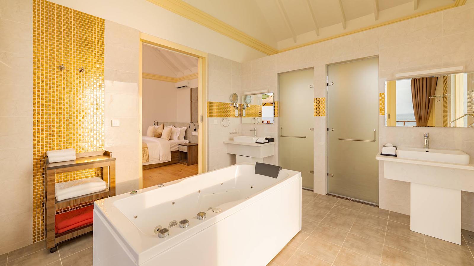 Perched above turquoise waters, this 348 sqm pavilion offers ultimate privacy and breathtaking sunset views. Enjoy a private freshwater pool, slide into the ocean, large terrace, kitchen, and separate indoor and outdoor dining. With two master bedrooms, two bathrooms, a jetted bathtub, mini bar, Wi-Fi, and personal butler service, it is the pinnacle of luxury and unforgettable Maldivian experiences.