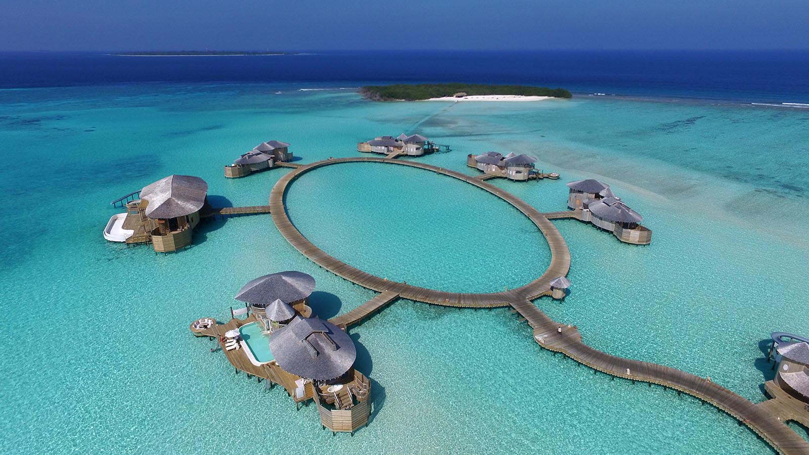 This our idea of what overwater living should be, with a huge 1,226 square metres of luxurious living space and uninhibited views in every direction. This huge villa features four private bedrooms, in addition to a study, gym, an outdoor shower and daybed, TV lounge, walk-in minibar and a sleeping area for the children, as well as a water slide from the top deck into the lagoon below.