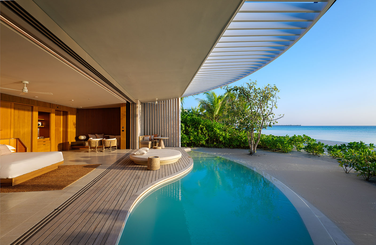 Cocooned in the verdant vegetation on the white sandy beach, 4 Two Bedroom Beach Pool Villas Offer unparalleled indoor and outdoor living spaces.