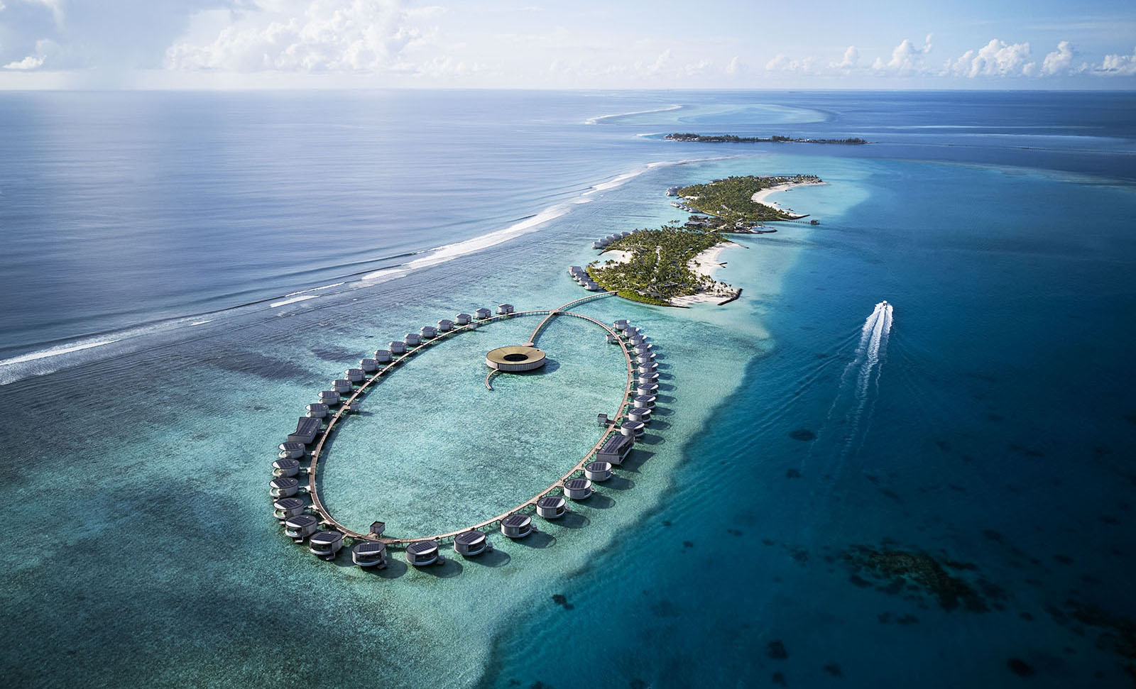 The 13.5-hectare resort presents 100 elegantly designed villas by Kerry Hill Architects, nestled overwater or on the beach inspired by the ocean forces, wind, and waves. Indoor and outdoor spaces, each villa offers a private pool, sundeck, ensuite bathroom, and a lavish collection of personalised amenities.