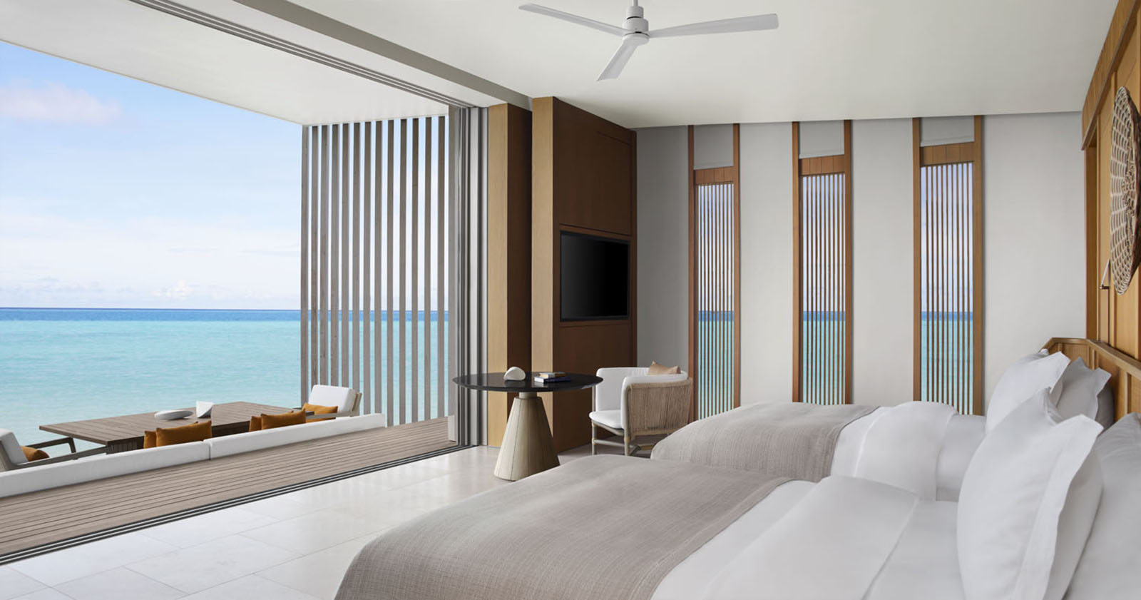 Located on a private beach cove, The Ritz-Carlton Estate presents three pavilions with three bedrooms, a living and dining room, a kitchen, a spa suite, and an expansive sundeck with outdoor dining and an infinity pool overlooking the sunset. Every detail of the stay is curated by a dedicated Aris Meeha, island butler, and a personal chef.